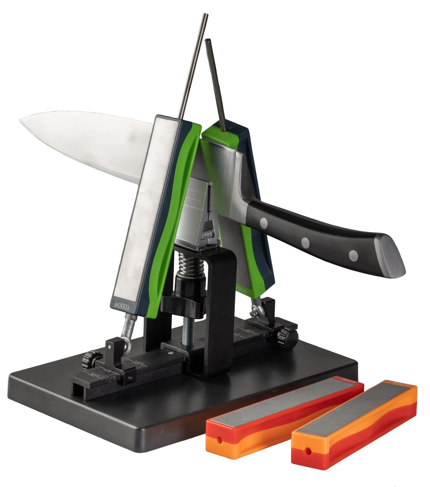 - Bepaal de juiste slijphoek voor het mes. Dit doe je door aan beide kanten het tandwiel te verschuiven en op de juiste slijphoek te positioneren. Monteer vervolgens de geleiderstaafjes op deze positie vast.