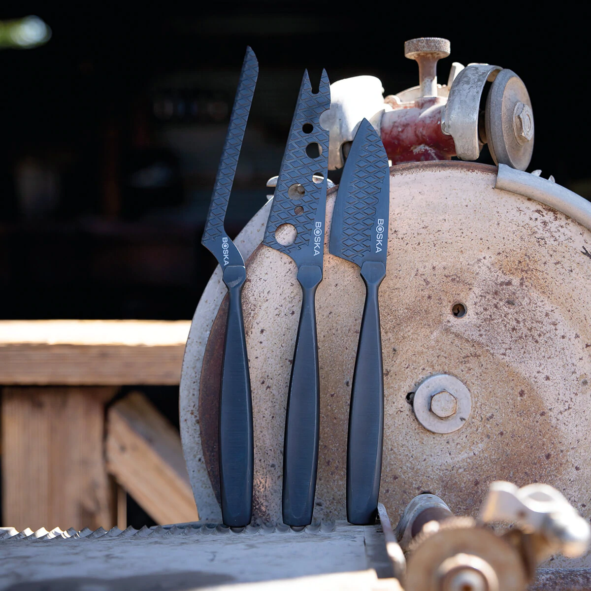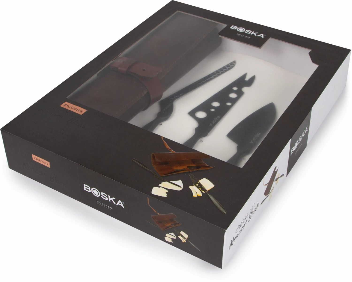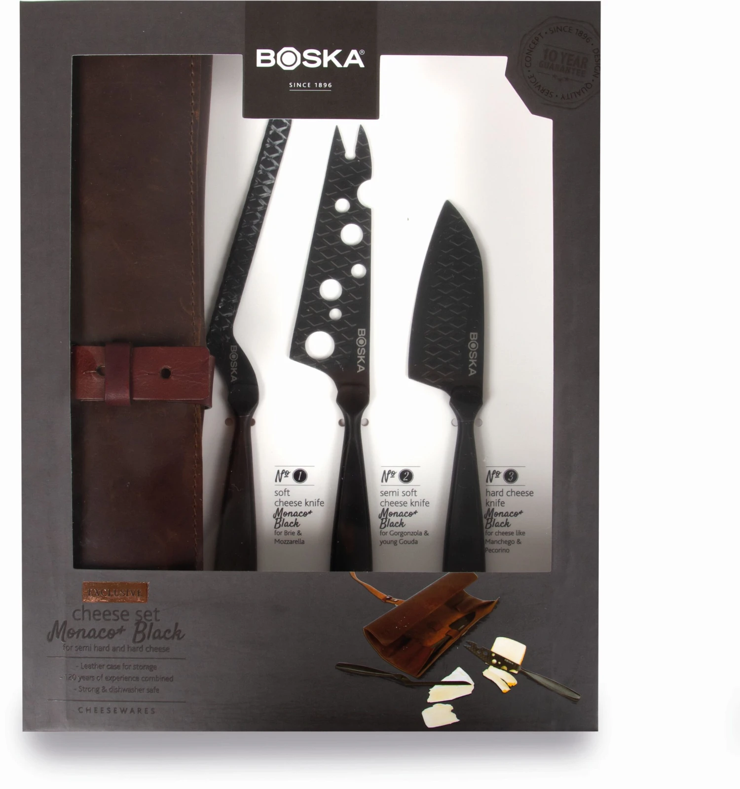 De Boska Kaasmessenset Monaco+ Zwart is de perfecte kaasmessenset voor iedere kaasfan. Alle drie de messen zijn van zeer hoge kwaliteit en geoptimaliseerd voor hun eigen soort kaas. Van smeuïge brie tot harde Parmezaan: met deze roestvrijstalen messen krijg je elk type kaas klein. De messen hebben allemaal een non-stick coating en zijn van RVS waardoor je ze gemakkelijk reinigt in de vaatwasser.