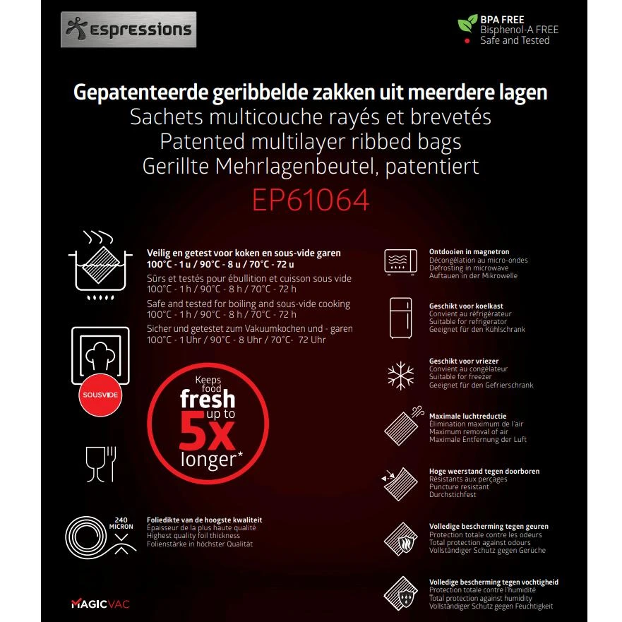 Garandeer dat er geen lucht of vocht meer bij je voedsel kan komen door te vacumeren met deze vacumeerzakken van Espressions. Door te vacumeren kan je voedsel tot wel vijf keer langer bewaren en de smaken blijven behouden. Met de dikte van 240 micron zijn deze zakken van hoge kwaliteit en ze zijn BPA vrij. De formaten van deze zakken zijn 30 bij 40 centimeter en het zijn er 50 stuks. Ook geschikt voor sous vide koken! Let op: het sous vide koken is veilig en getest voor 100? voor 1 uur, 90? voor 8 uur, 70? voor 72 uur.