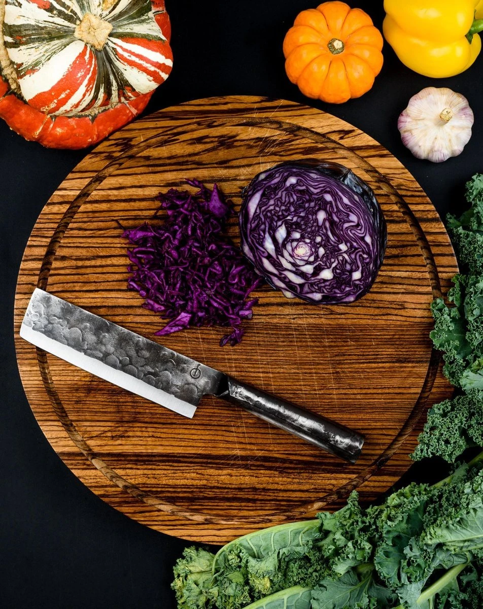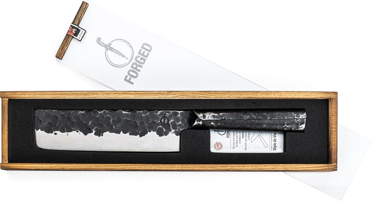 De Forged Brute, ook wel Nakiri genoemd, oftewel Japans groentemes. Dit mes is een must have voor het het flinterdun snijden en hakken van groenten en kruiden. De Forged Brute messen zijn vervaardigd van Japans 440C Staal met een hardheid van 58 Rockwell. Alle Forged messen zijn met de hand gesmeed, hebben een lemmetdikte van 2 mm en een snijhoek van 18 graden. Verpakt in een luxe houten kistje.