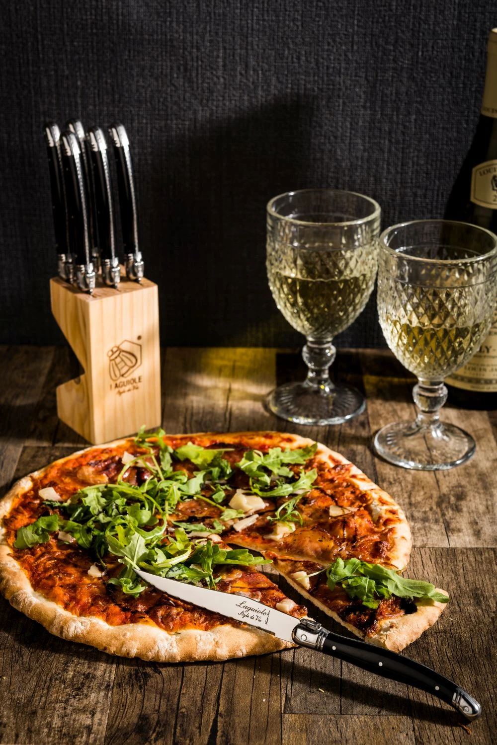 Laguiole Style de Vie Premium Line Steakmessen bestaat uit 6 Laguiole steakmessen met gekarteld lemmet. De steakmessenset van Laguiole Style de Vie zijn gemaakt van hoogwaardige materialen die voor een luxe en elegante uitstraling zorgen. De messen hebben een klassieke vormgeving met het icoon van Laguiole op het heft. De Laguiole messenset wordt geleverd in een mooi, stabiel en stevig messenblok waardoor de set gelijk een prachtig cadeau is en direct op het aanrecht geplaatst kan worden.